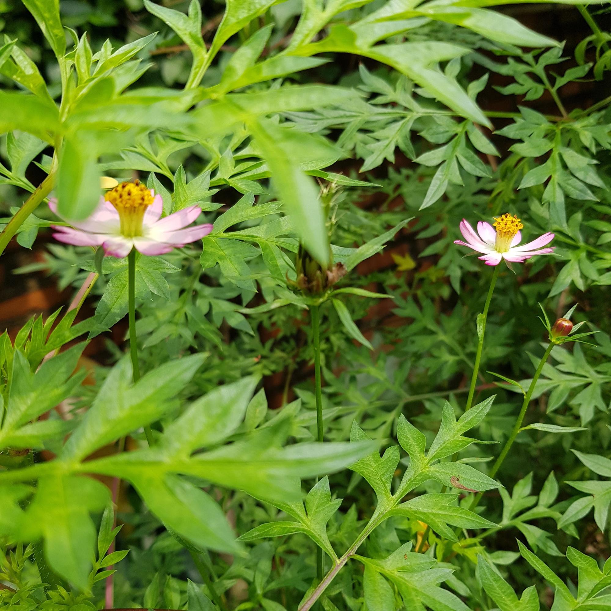 Cosmos are cute and there are some varieties that are edible. The one that I eat, Cosmos caudatus, has pink-white flowers. They make a good bush. We eat the leaves. The young leaves can be added to salads or eaten straight away. They have a strong taste, I don’t particularly like it but they look nice and always good to have something to eat when I don’t have any vegetables in the fridge. They are basically weeds. They would live and spread their seeds on their own.