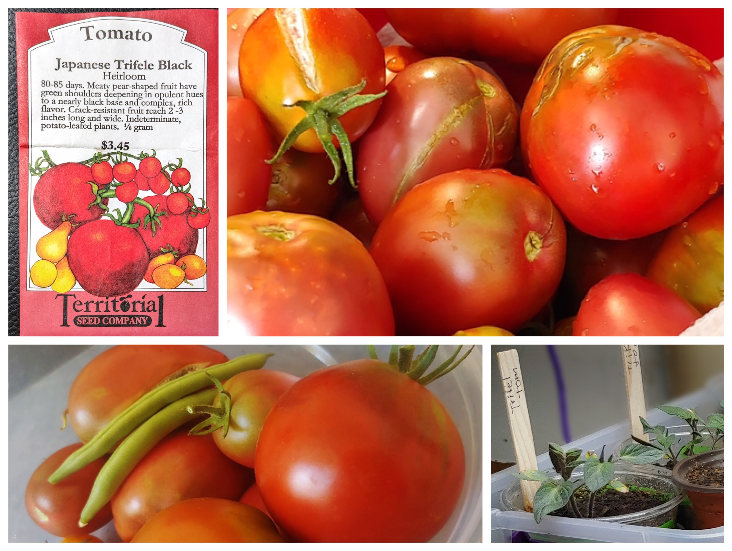 ‘Japanese Trifele Black’ These sit halfway between a dense sauce tomato and a nice moderately dry slicer tomato. I love the odd green gradation they keep at their stem end, and I love the slightly smokey-beefy flavor they have even more. The bowls and bowls full of delicious tomatoes that convinced my spouse that tomatoes weren't disgusting.