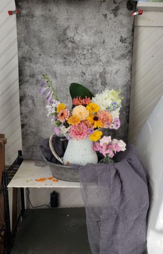 My setup for day-to-day harvests is super simple. It’s just a little wire utility shelf in my crammed mud room, roughly measuring about three feet by three feet for the overall shooting space. On the shelf, I have an artboard (basically just matboard) from the art supply store.