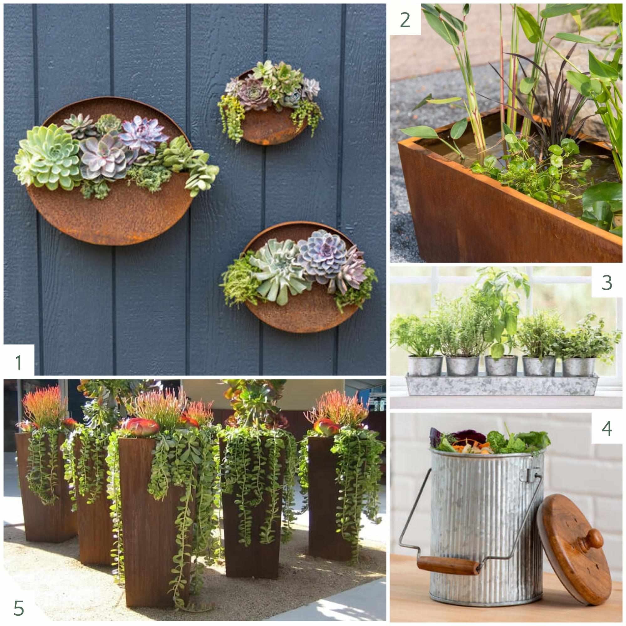 A large selection of metal pieces, from planters to fire pits, is available from retailers like Gardener’s Supply Company, West Elm, and Wayfair. Some are smaller and more affordable like corten steel wall planters, galvanized watering cans, compost pails, and a set of four inch planters with tray that’s just right for a windowsill.