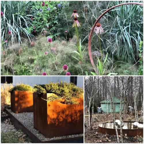 For those looking for a more streamlined, modern aesthetic, corten steel is another popular option for raised beds, planters, water features, and edging. The material has been used in construction since the 1930s and for outdoor sculptures since the 1950s and 60s. One notable example is a 50 ft cubist sculpture by Picasso in Chicago, Illinois. Corten steel products start their life in a soft grey color but quickly develop a protective oxide film that is rust-like in appearance, which (in theory) slows down future corrosion. Garden designer Nick McCullough is a big fan of this material and uses it for client projects and in his own garden. Slick corten hoops contrast with billowy bronze fennel in one of his meadow-like planting schemes, trailing junipers spill down the sides of his custom made corten “G&T” planters, and reflective chrome spheres float in a corten pond.