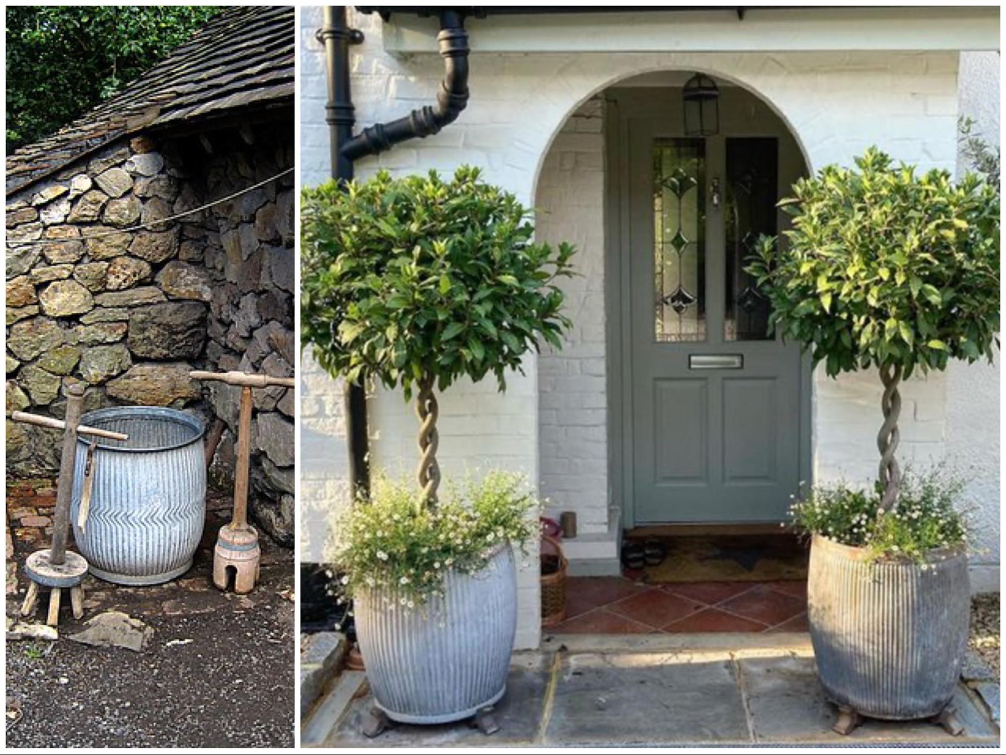 Left: Dolly tub (also called posser) and possticks at Blists Hill Victorian Town in Shropshire, England. Photo by Snapshooter46 is licensed under CC BY-NC-SA 2.0. Right: topiarized bay trees in vintage dolly tubs at Warrick Garden in Oxfordshire, England. Photo courtesy of @warrickgarden.