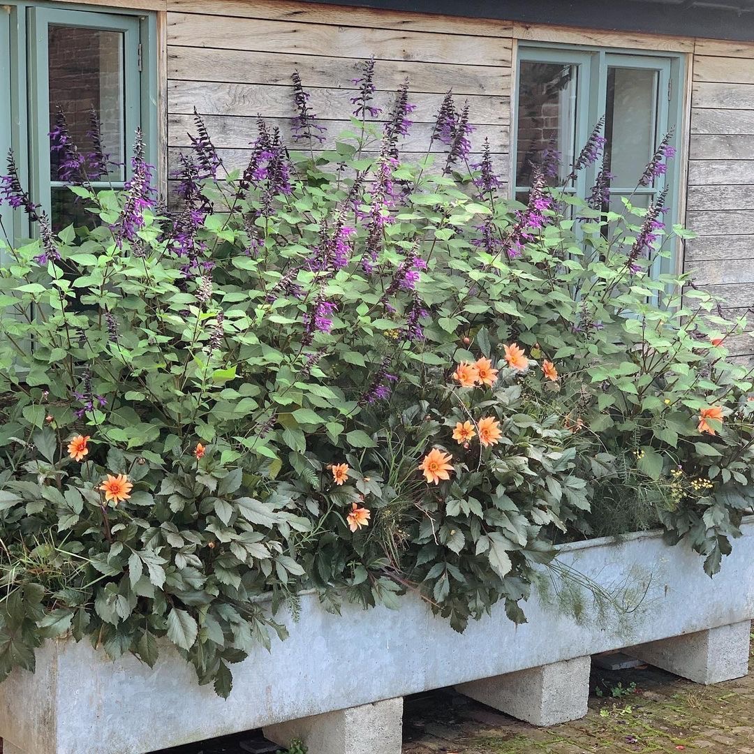 An old cattle feeder turned into a planter by Jenny Williams of @thelaundrygarden. It has been planted with ‘Waltzing Mathilda’ dahlias, panicum ‘Rehbraun’, salvia ‘Amistad’, Bronze Fennel (Foeniculum vulgare), and Antirrhinum majus ‘Black Prince.’ Silver birch branches are used as plant supports. Photo courtesy of Jenny Williams.