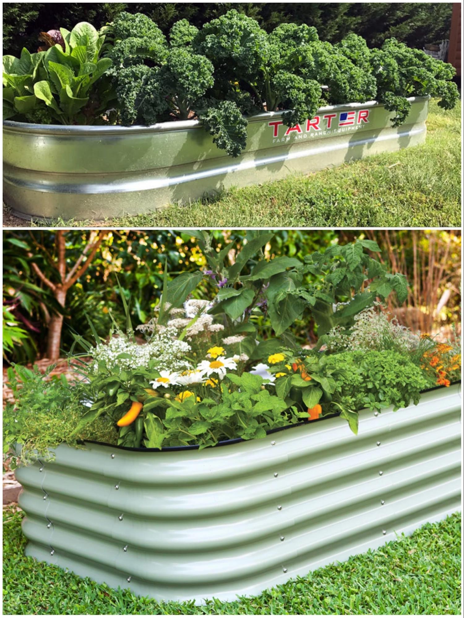 The Impatient Gardener, Erin, turned a large round galvanized feed tank into a water lily pond with solar powered fountain — the centerpiece of her vegetable garden. Laura of Garden Answer turned stock tanks into planters for colorful annuals and strawberries, cascading off the sides. Capitalizing on the use of their feed tanks for edible gardens, manufacturers like Tarter and Behlen have started offering “bottomless” stock tanks for use as raised beds. Other options for raised beds like the Birdies brand popularized by Kevin Espiritu of Epic Gardening are made from corrugated steel. For a cheaper DIY option, landscape architect Bunny Guinness suggests using corrugated iron sheeting attached to pressure treated posts.