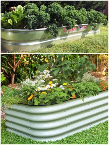 Top: an oval raised bed planter from Tarter. Bottom: a modular Birdies raised bed from Epic Gardening.
