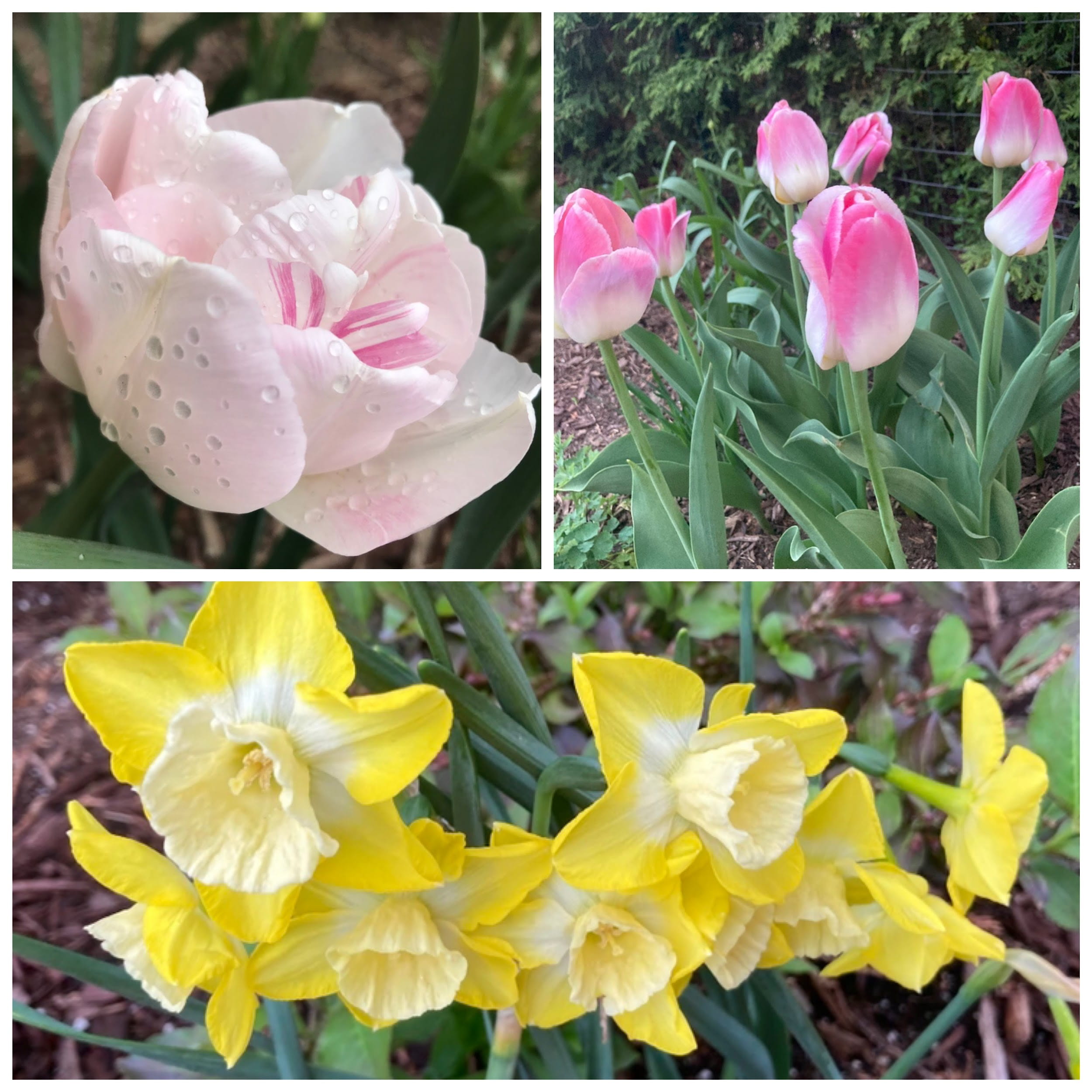 Clockwise from top left: ‘Angelique’ tulip, ‘Kunyun’ Darwin hybrid tulips and ‘Hillside’ daffodils.