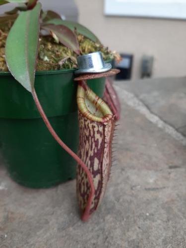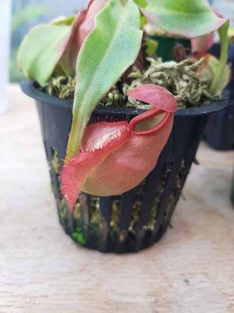 As with lighting, Nepenthes are extremely flexible with the variety of soils they will tolerate. Soil ingredients may include sphagnum moss, perlite, peat moss, orchid bark, akadama and other clays, coconut bark, sand, and pumice. Beware that some brands of these ingredients contain fertilizers which will kill Nepenthes. All ingredients within their soil should be low in nutrient content. Sphagnum moss is by far the most common and popular substrate, with many growers using only pure sphagnum and nothing more. Sphagnum moss mixed with about a third perlite or pumice allows for improved drainage and is preferable. Certain Nepenthes such as N. rajah demand mixes including high mineral content and exhibit limited success when grown in a mix of purely organic substrates. Two soil additives that are more controversial are coconut coir and peat moss. Coconut coir has been known to contain dangerous levels of salt for Nepenthes while peat moss has extremely poor drainage and should never be used as the majority in a mixture. When potting Nepenthes, you may choose plastic pots with drainage or net pots. Terracotta has been known to occasionally kill Nepenthes due to the minerals it contains. Pot size is generally better kept small and plants tend to only need repotting well after their leafspans double the width of their pots. You will know repotting is necessary when there are roots visible through the drainage holes of the pot.